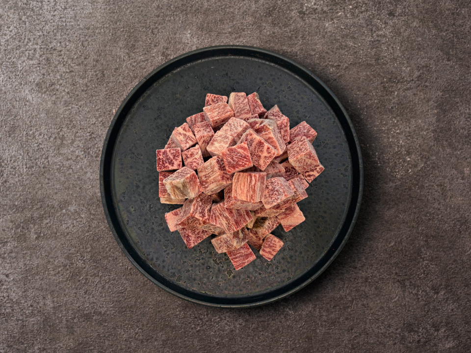 希少部位である“トモサンカク”をサイコロ状にカットしたステーキです。お気軽に調理いただける真空包装ではないボリュームパック!急速冷凍により一粒一粒がほぐれた状態で凍結されているため、必要な分だけ取り出してお使いいただけます。